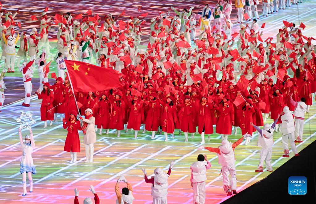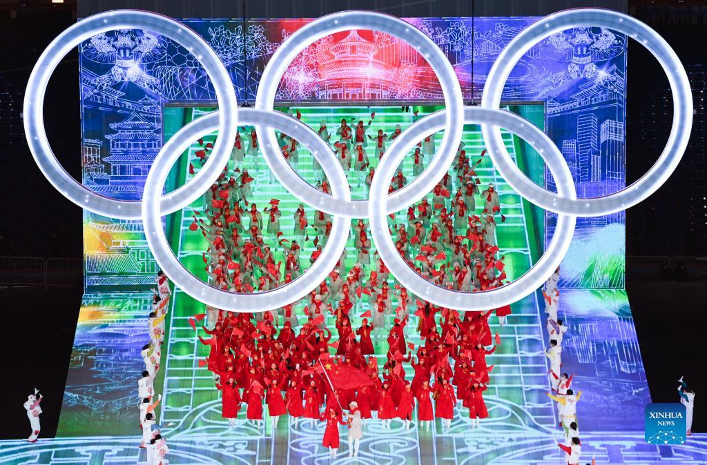 The Olympic delegation of the People's Republic of China parade into the National Stadium during the opening ceremony of the Beijing 2022 Olympic Winter Games in Beijing, capital of China, Feb. 4, 2022. (Xinhua/Cao Can)