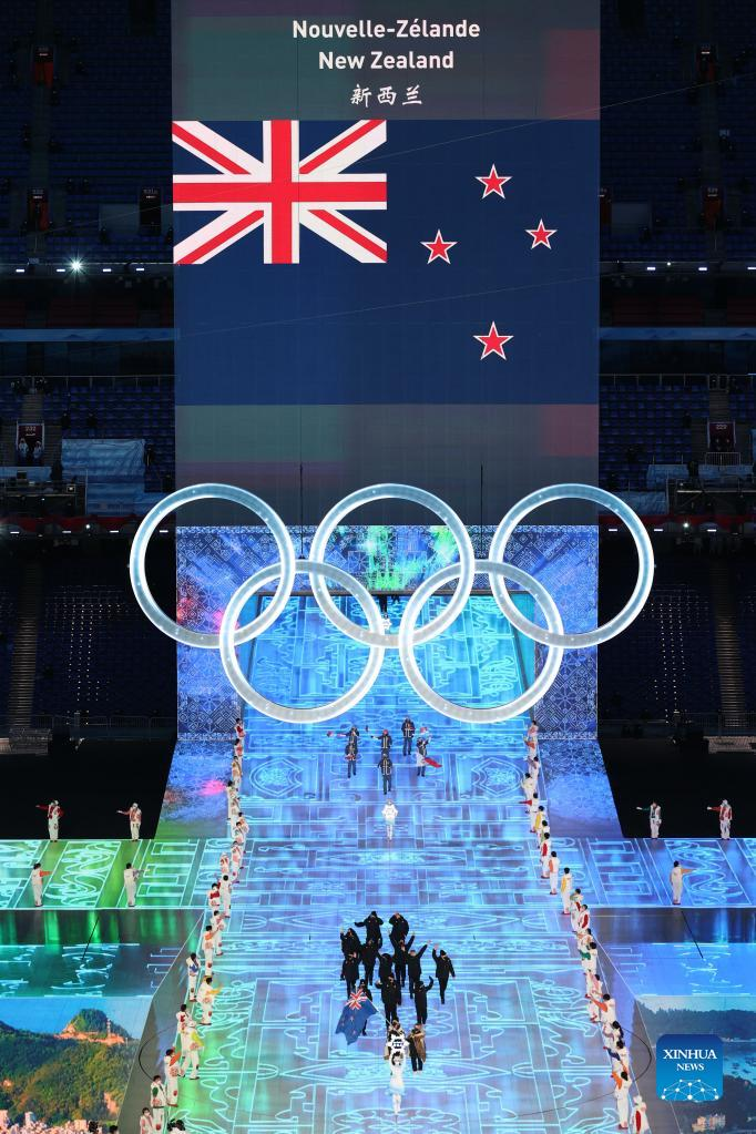 The Olympic delegation of New Zealand parade into the National Stadium during the opening ceremony of the Beijing 2022 Olympic Winter Games in Beijing, capital of China, Feb. 4, 2022. (Xinhua/Li Ziheng)