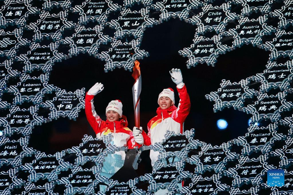 Torch bearers Zhao Weichang (L) and Li Yan gesture during the opening ceremony of the Beijing 2022 Olympic Winter Games at the National Stadium in Beijing, capital of China, Feb. 4, 2022. (Xinhua/Xiong Qi)