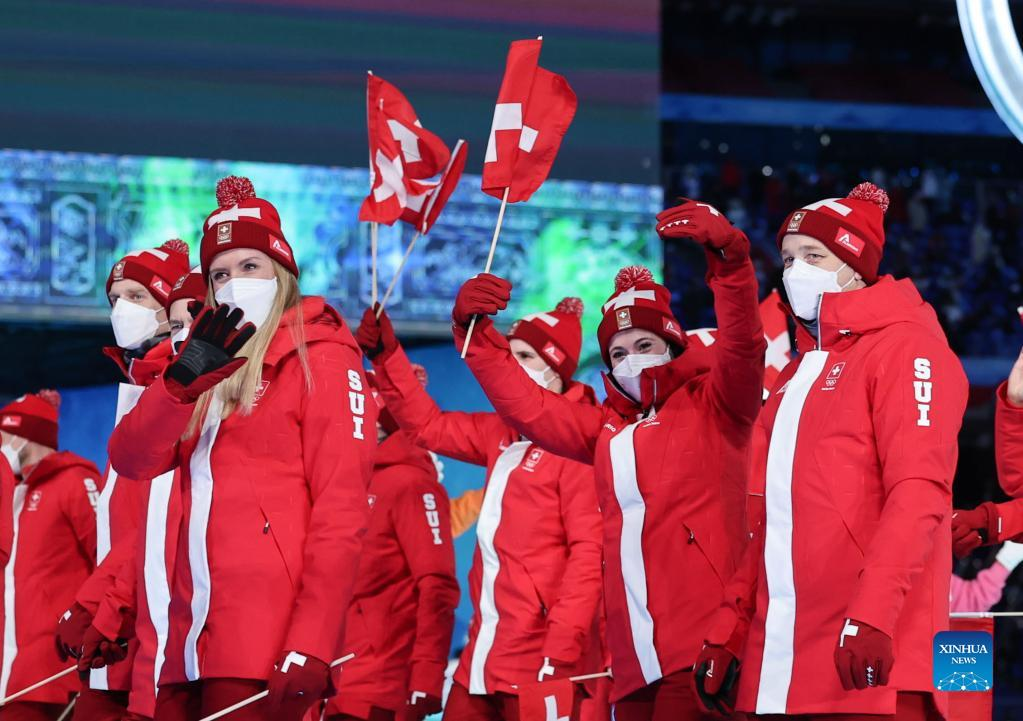 The Olympic delegation of Switzerland parade into the National Stadium during the opening ceremony of the Beijing 2022 Olympic Winter Games in Beijing, capital of China, Feb. 4, 2022. (Xinhua/Cao Can)