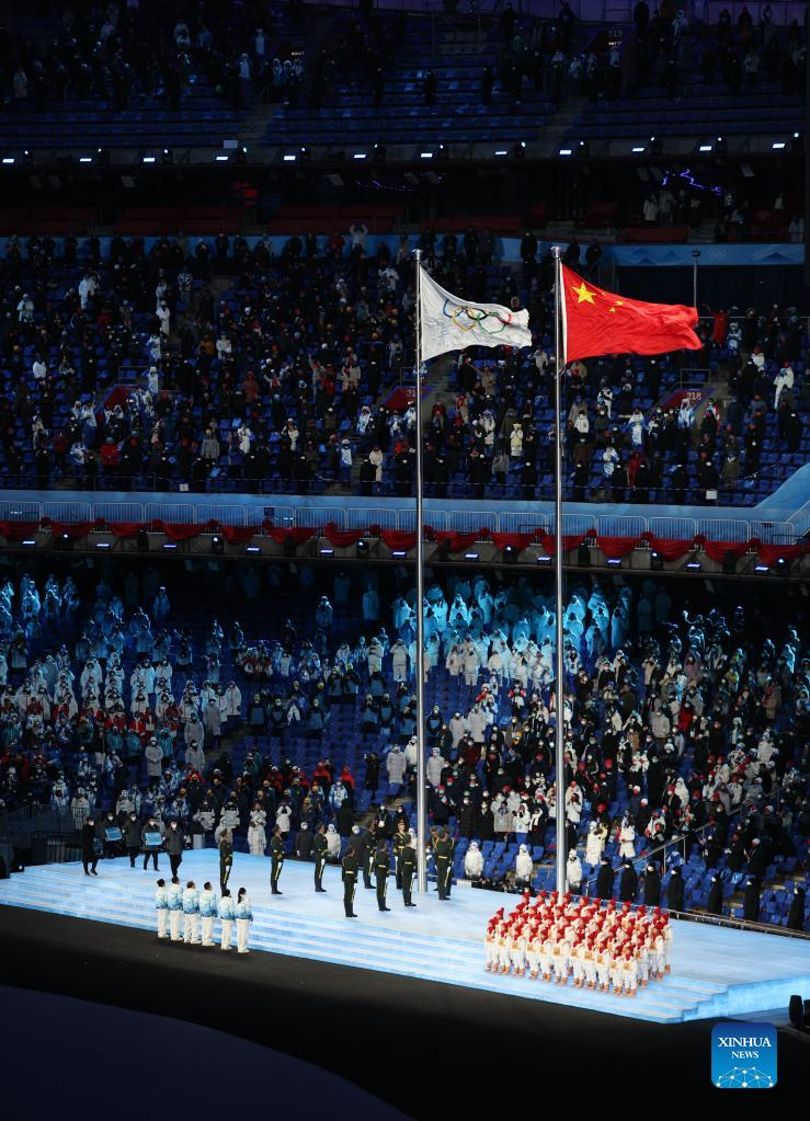 The Olympic flag is raised during the opening ceremony of the Beijing 2022 Olympic Winter Games at the National Stadium in Beijing, capital of China, Feb. 4, 2022. (Xinhua/Ju Huanzong)