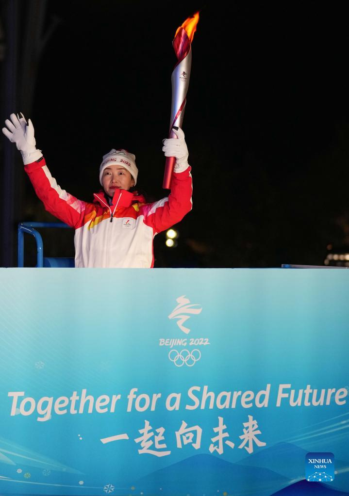 Torch bearer Zhou Yang runs with the Olympic torch during the opening ceremony of the Beijing 2022 Olympic Winter Games at the National Stadium in Beijing, capital of China, Feb. 4, 2022. (Xinhua/Ju Huanzong)