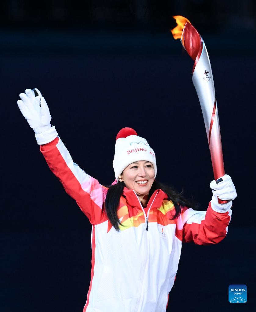 Torch bearer Zhang Junying prepares to lit the cauldron outside the National Stadium during the opening ceremony of the Beijing 2022 Olympic Winter Games in Beijing, capital of China, Feb. 4, 2022. (Xinhua/Li Yibo)