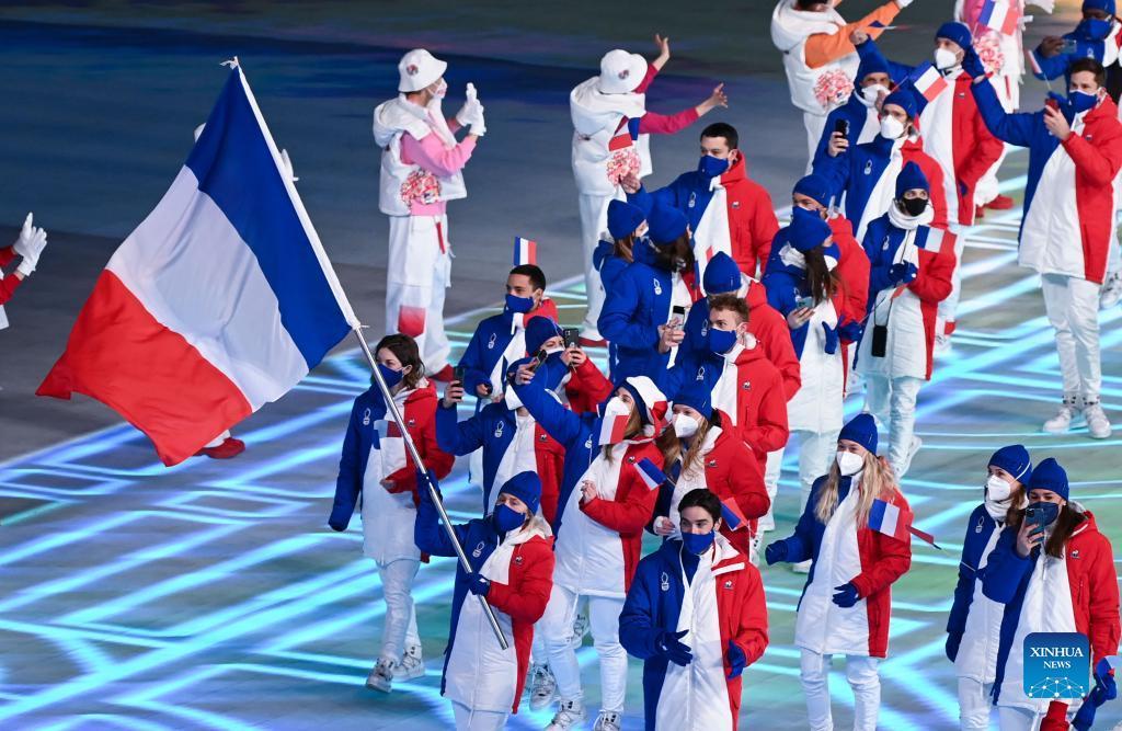 The Olympic delegation of France parade into the National Stadium during the opening ceremony of the Beijing 2022 Olympic Winter Games in Beijing, capital of China, Feb. 4, 2022. (Xinhua/Xiong Qi)