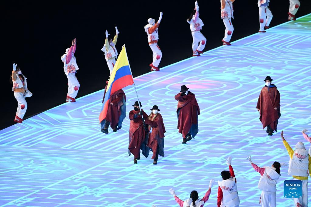 The Olympic delegation of Colombia parade into the National Stadium during the opening ceremony of the Beijing 2022 Olympic Winter Games in Beijing, capital of China, Feb. 4, 2022. (Xinhua/Huang Zongzhi)
