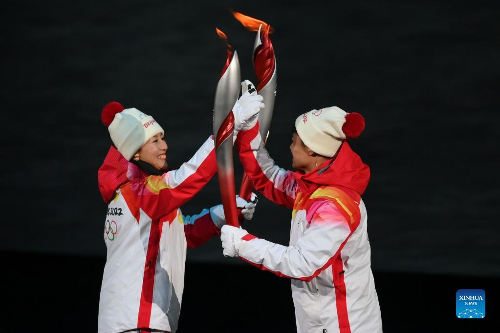 Torch bearers Dinigeer Yilamujiang (L) and Zhao Jiawen set the torch into the Olympic cauldron during the opening ceremony of the Beijing 2022 Olympic Winter Games at the National Stadium in Beijing, capital of China, Feb. 4, 2022. (Xinhua/Li Ga)