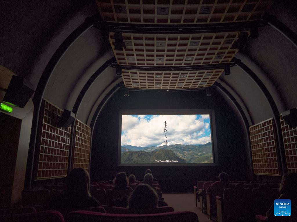 Audiences watch the Chinese film "The Taste of Rice Flower" in the National Center for Creativity in Valletta, Malta, on Feb. 4, 2022. The Happy Chinese New Year Film Festival in Malta, part of the Chinese New Year activities, kicked off Friday evening in Valletta. (Photo by Jonathan Borg/Xinhua)