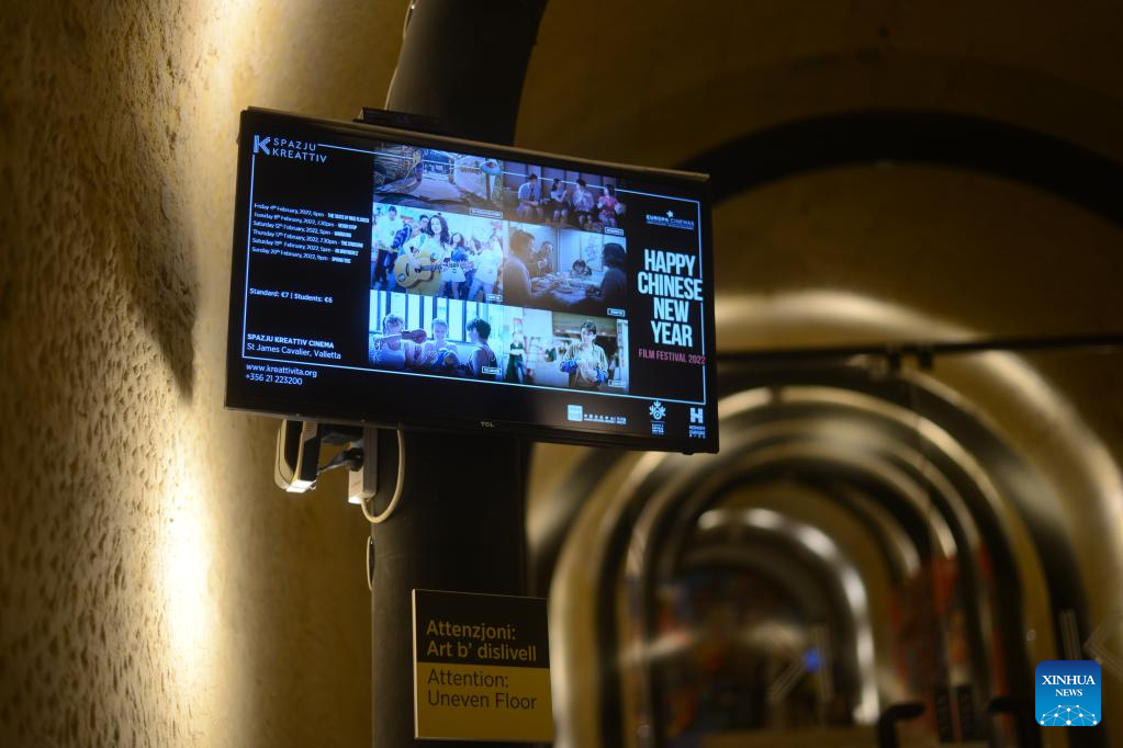 A screen displays Chinese films shown in the Happy Chinese New Year Film Festival in the National Center for Creativity in Valletta, Malta, on Feb. 4, 2022. The Happy Chinese New Year Film Festival in Malta, part of the Chinese New Year activities, kicked off Friday evening in Valletta. (Photo by Jonathan Borg/Xinhua)