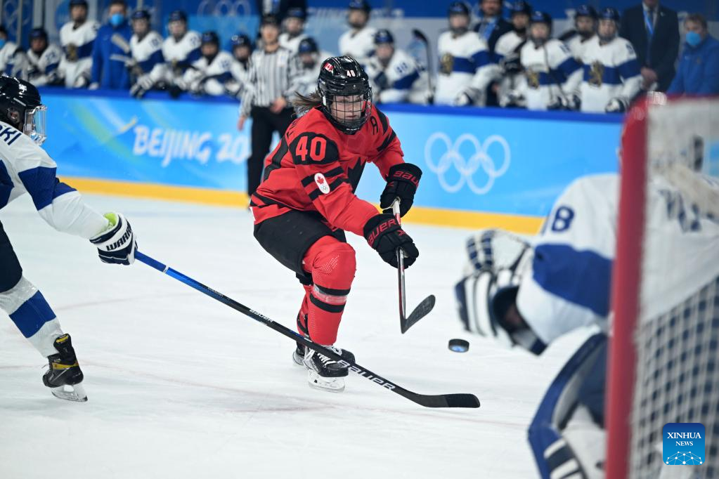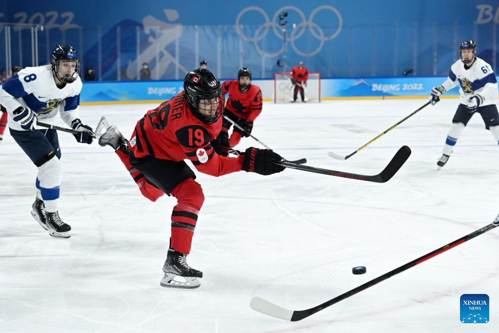 Blayre Turnbull (C) of Canada attacks during the ice hockey women's preliminary round group A match between Canada and Finland at Wukesong Sports Centre in Beijing, capital of China, Feb. 5, 2022. (Xinhua/Ma Ning)