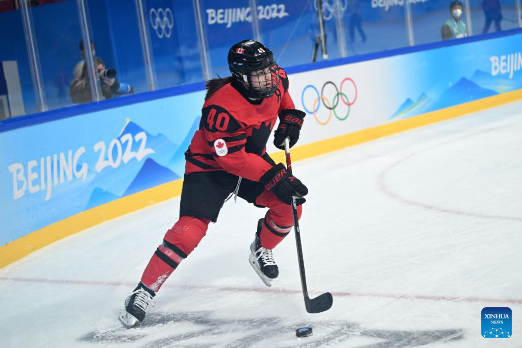 Blayre Turnbull of Canada controls the puck during the ice hockey women's preliminary round group A match between Canada and Finland at Wukesong Sports Centre in Beijing, capital of China, Feb. 5, 2022. (Xinhua/Ma Ning)