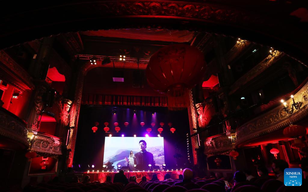 French singer Nathasha St-Pier (on stage) performs during the recording of the "Peace, Friendship, Love" concert at Theater du Gymnase Marie Bell in Paris, France, Jan. 26, 2022. On the first day of the Year of the Tiger, a special program dedicated to the Beijing Winter Olympic Games and Paris 2024 Olympic Games was broadcast on France's TV5 Monde on Feb. 1, 2022.