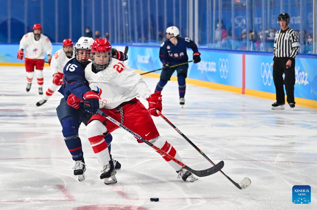 (220206) -- BEIJING, Feb. 5, 2022 (Xinhua) -- Savannah Harmon (L) of the Russian Olympic Committee vies with Polina Bolgareva of the United States during the women's ice hockey preliminary round Group A match between the United States and the Russian Olympic Committee at Wukesong Sports Centre in Beijing, capital of China, Feb. 5, 2022. (Xinhua/Song Yanhua)