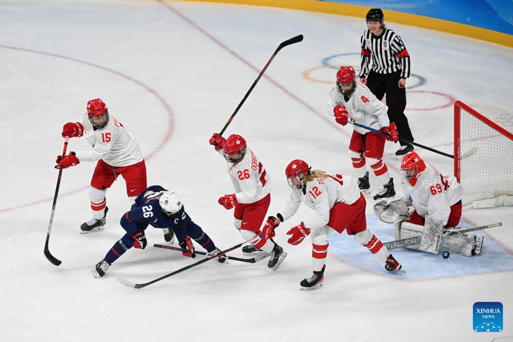 Kendall Coyne Schofield (2nd L) of the United States shoots the gate during the women's ice hockey preliminary round Group A match between the United States and the Russian Olympic Committee at Wukesong Sports Centre in Beijing, capital of China, Feb. 5, 2022. (Xinhua/Huang Zongzhi)