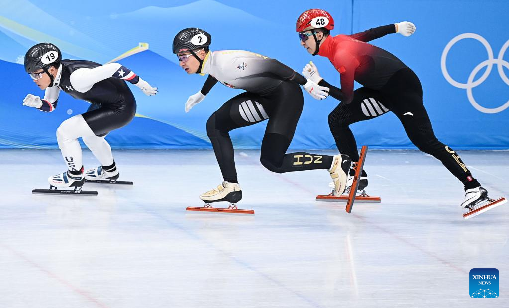 Wu Dajing (R) of China competes during the mixed team relay semifianl of short track speed skating at Capital Indoor Stadium in Beijing, China, Feb. 5, 2022. (Xinhua/Xiong Qi)