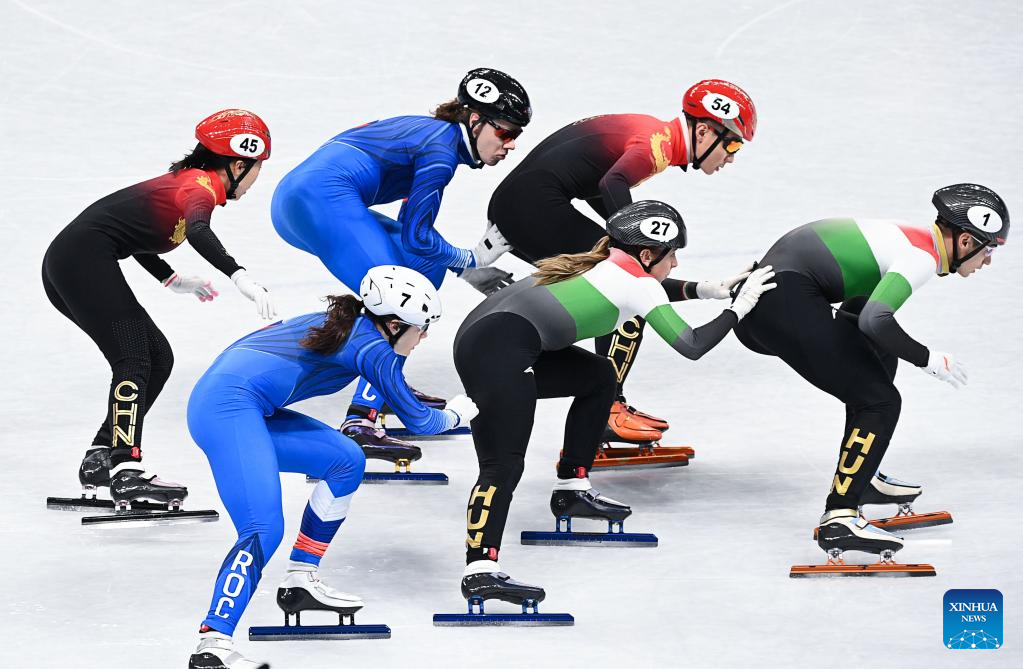 Athletes compete during the mixed team relay semifianl of short track speed skating at Capital Indoor Stadium in Beijing, China, Feb. 5, 2022. (Xinhua/Xiong Qi)