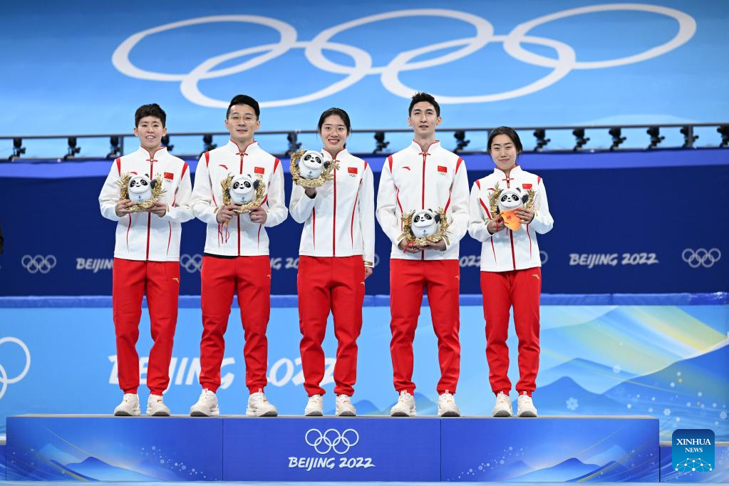 Fan Kexin (1st L), Ren Ziwei (2nd L), Qu Chunyu (C), Wu Dajing (2nd R) and Zhang Yuting of China celebrate during the flower ceremony after the mixed team relay final of short track speed skating at the Capital Indoor Stadium in Beijing, China, Feb. 5, 2022. (Xinhua/Ju Huanzong)