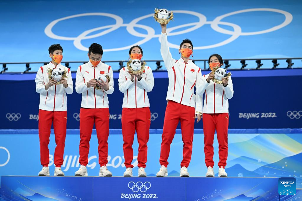 Fan Kexin (1st L), Ren Ziwei (2nd L), Qu Chunyu (C), Wu Dajing (2nd R) and Zhang Yuting of China celebrate during the flower ceremony after the mixed team relay final of short track speed skating at the Capital Indoor Stadium in Beijing, China, Feb. 5, 2022. (Xinhua/Ju Huanzong)