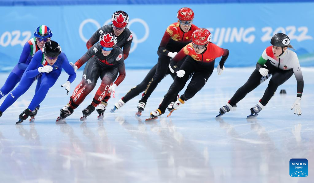 Qu Chunyu (front 2nd R) competes during the mixed team relay final of short track speed skating at the Capital Indoor Stadium in Beijing, China, Feb. 5, 2022. (Xinhua/Cao Can)