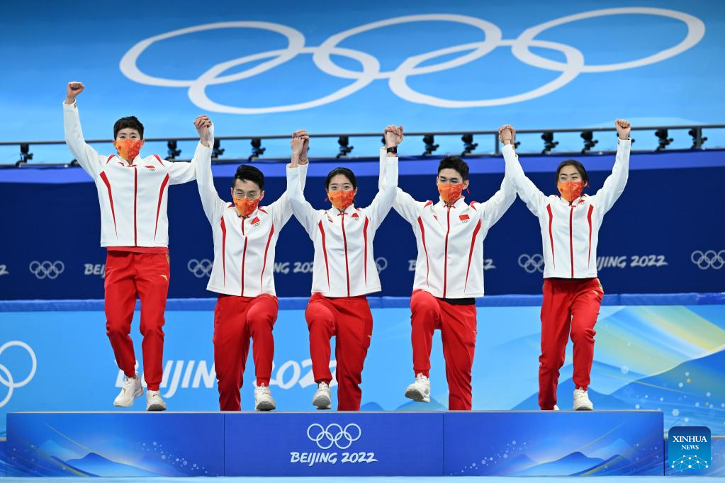 Fan Kexin (1st L), Ren Ziwei (2nd L), Qu Chunyu (C), Wu Dajing (2nd R) and Zhang Yuting of China celebrate during the flower ceremony after the mixed team relay final of short track speed skating at the Capital Indoor Stadium in Beijing, China, Feb. 5, 2022. (Xinhua/Ju Huanzong)