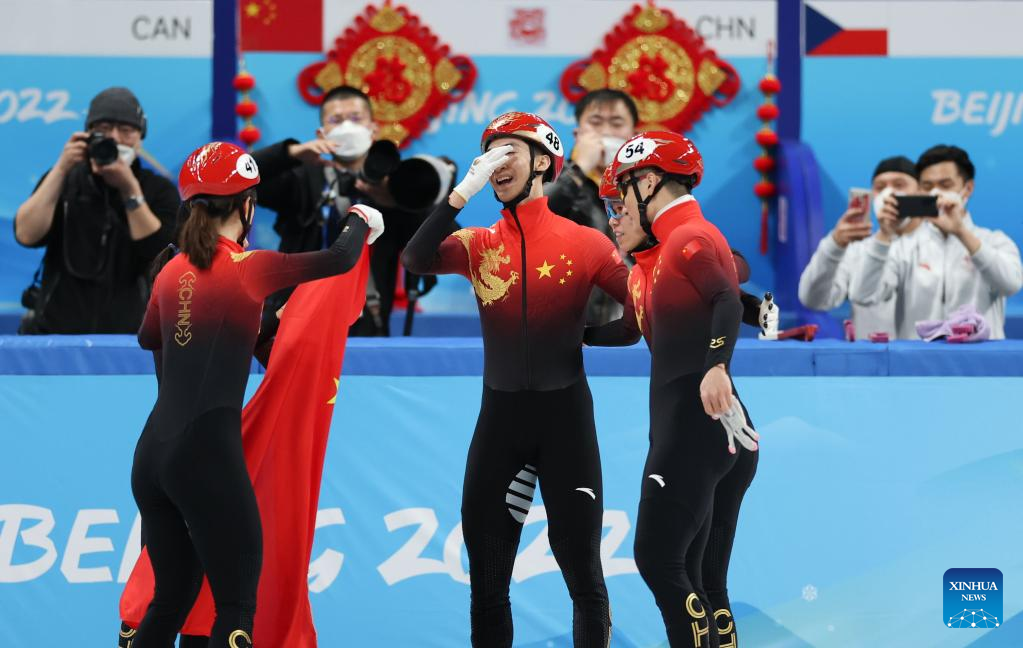 Athletes of China celebrate victory after winning the mixed team relay final of short track speed skating at the Capital Indoor Stadium in Beijing, China, Feb. 5, 2022. (Xinhua/Cao Can)
