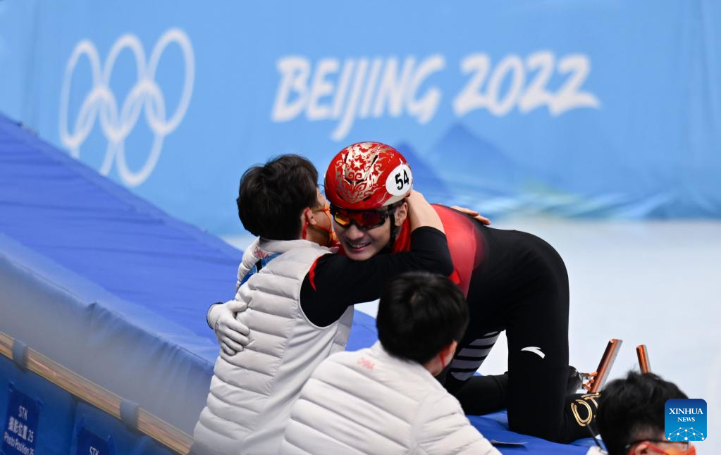 Ren Ziwei of China celebrates after the mixed team relay final of short track speed skating at the Capital Indoor Stadium in Beijing, China, Feb. 5, 2022. (Xinhua/Li Ga)