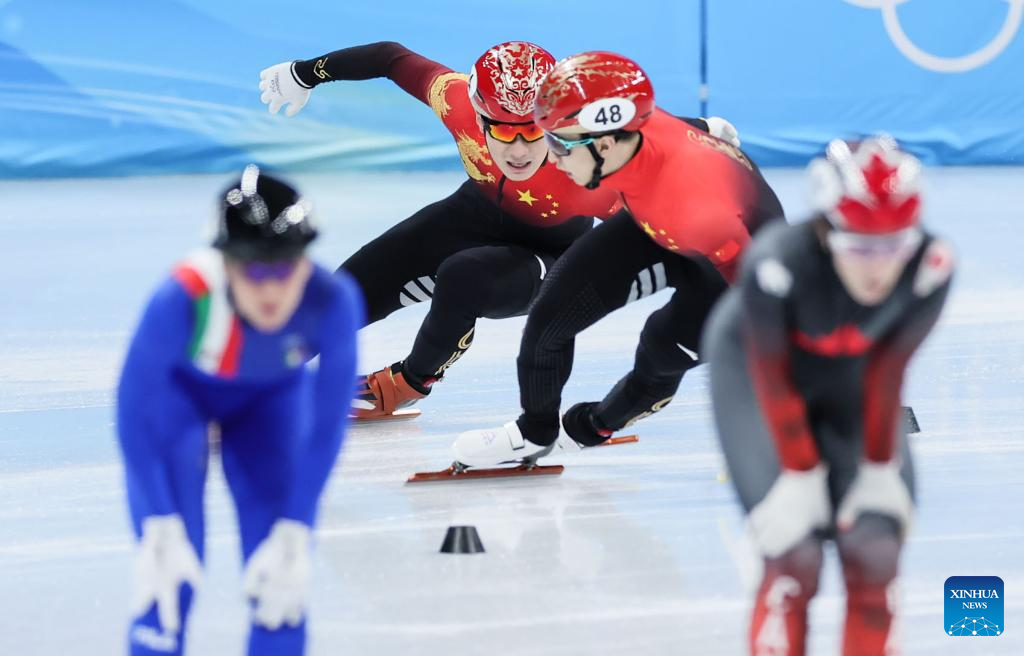 Wu Dajing (C, R) and Ren Ziwei (C, L) of China compete during the mixed team relay final of short track speed skating at Capital Indoor Stadium in Beijing, China, Feb. 5, 2022. (Xinhua/Lan Hongguang)