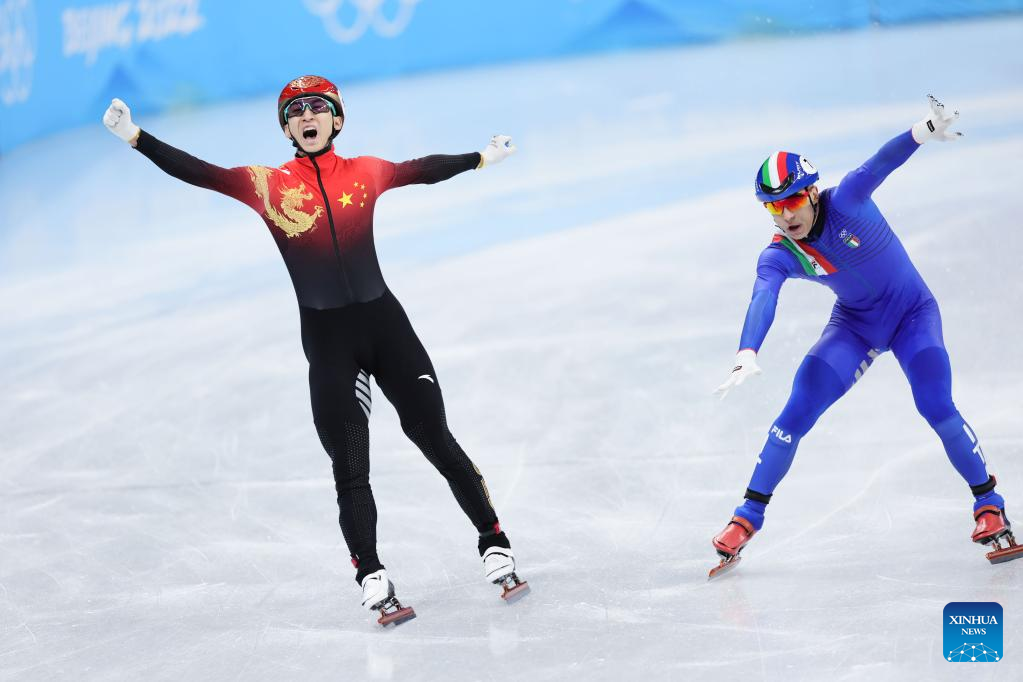 Wu Dajing (L) of China celebrates victory of the mixed team relay final of short track speed skating at the Capital Indoor Stadium in Beijing, China, Feb. 5, 2022. (Xinhua/Lan Hongguang)