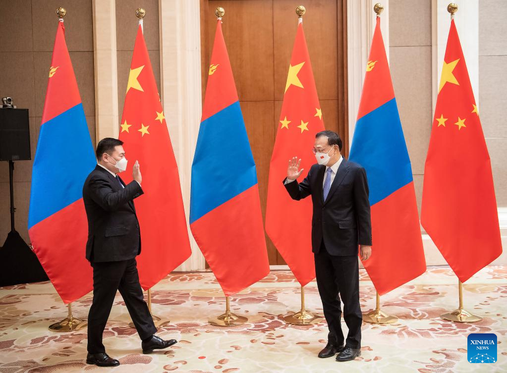 Chinese Premier Li Keqiang meets with Mongolian Prime Minister Luvsannamsrai Oyun-Erdene, who came to attend the opening ceremony of the Beijing 2022 Olympic Winter Games, at the Diaoyutai State Guesthouse in Beijing, capital of China, Feb. 5, 2022. (Xinhua/Li Tao)