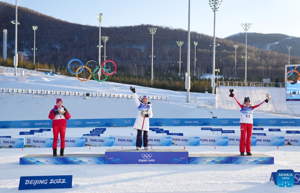 Gold medalist Therese Johaug (C) of Norway, silver medalist Natalia Nepryaeva (L) of ROC and bronze medalist Teresa Stadlober of Austria celebrate on the podium during the Flower Ceremony after the Cross-Country Skiing Women's 7.5km + 7.5km Skiathlon at National Cross-Country Skiing Centre in Zhangjiakou, north China's Hebei Province, Feb. 5, 2022. (Xinhua/Mu Yu)