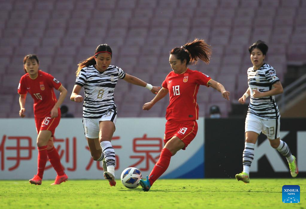 Tang Jiali (2nd R) of China vies with Cho So Hyun (2nd L) of South Korea during the final football match between China and South Korea at the 2022 AFC Women's Asian Cup in Mumbai, India, Feb. 6, 2022. (Xinhua/Javed Dar)