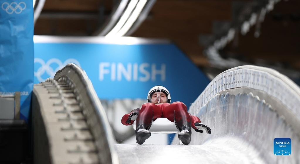 Kristers Aparjods of Latvia competes during Men's Singles Run of luge event at the Yanqing National Sliding Centre in Yanqing District of Beijing, capital of China, Feb. 6, 2022. (Xinhua/Yao Jianfeng)
