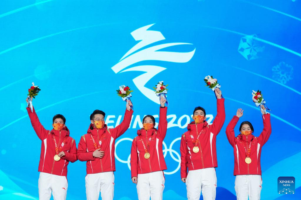 Gold medalists Fan Kexin (1st L), Ren Ziwei (2nd L), Qu Chunyu (C), Wu Dajing (2nd R) and Zhang Yuting of China celebrate during the awarding ceremony of the mixed team relay of short track speed skating event at the Beijing Medals Plaza of the Winter Olympics in Beijing, capital of China, Feb. 6, 2022. (Xinhua/Ju Huanzong)