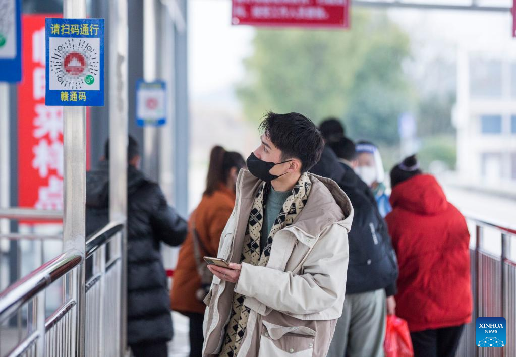 Passengers scan the health QR code before entering a railway station in Duchang County, east China's Jiangxi Province, Feb. 6, 2022.