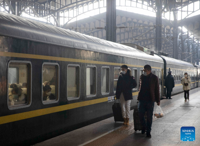 Passengers walk to board a train in Harbin Railway Station in Harbin, northeast China's Heilongjiang Province, Feb. 6, 2022.
