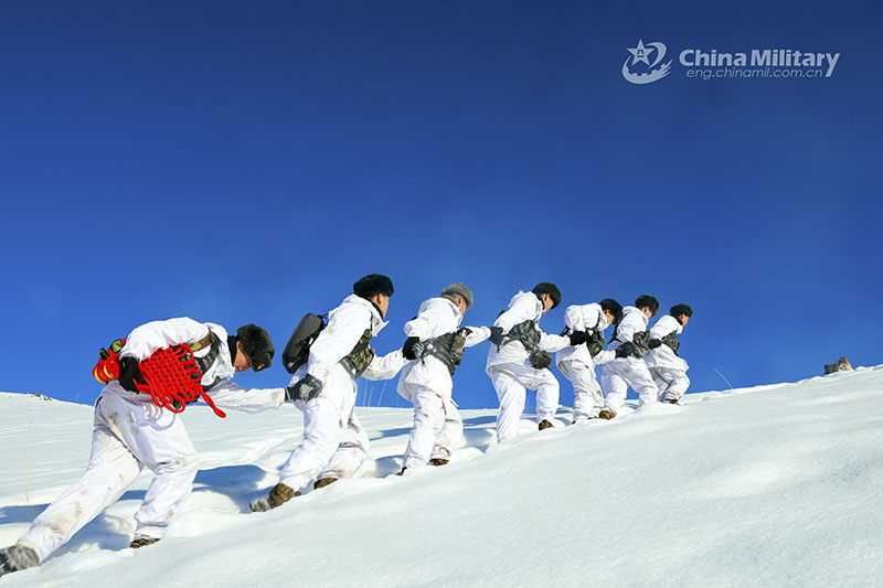 Soldiers assigned to the Hongshanzui Border Defense Company of the PLA Xinjiang Military Command go on patrol in the Altai Mountains against thick snow during the Spring Festival, also known as the Chinese Lunar New Year. (eng.chinamil.com.cn/Photo by Xiao Guotao)