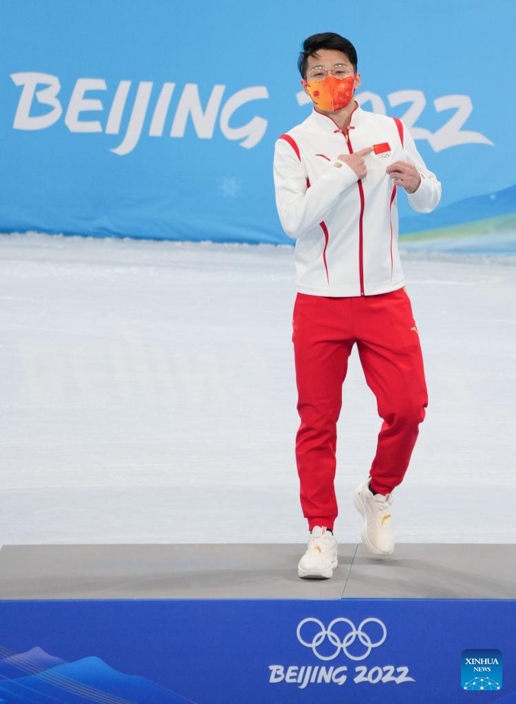 China's Ren Ziwei attends the flower ceremony after the men's 1000m final of short track speed skating at Capital Indoor Stadium in Beijing, capital of China, Feb. 7, 2022. (Xinhua/Wang Yuguo)