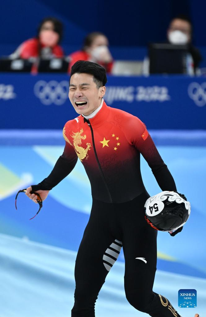 Ren Ziwei of China celebrates after the men's 1000m final of short track speed skating at Capital Indoor Stadium in Beijing, capital of China, Feb. 7, 2022. (Xinhua/Ju Huanzong)