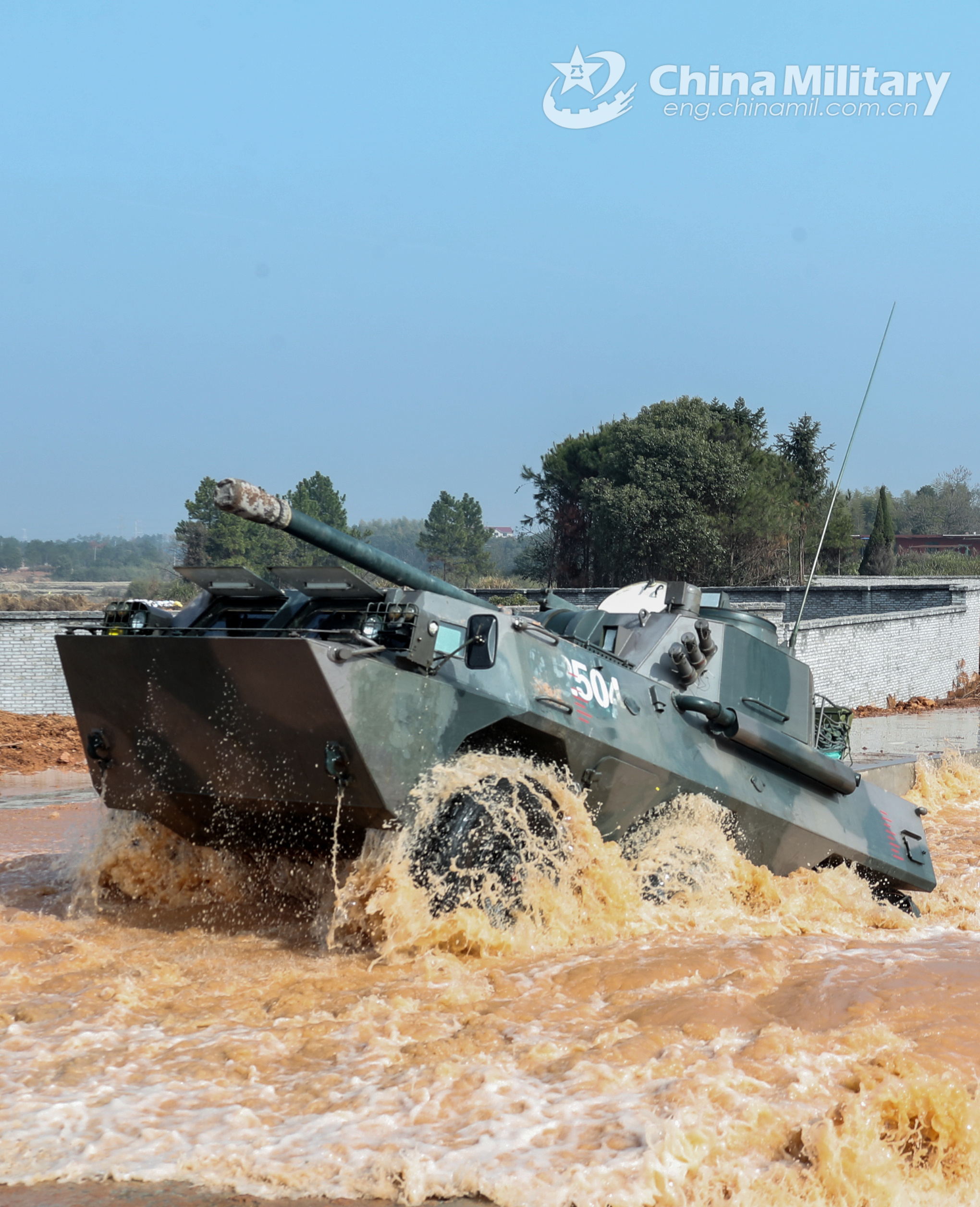 A self-propelled mortar-howitzer system attached to the PLA 72nd Group Army wades through a water obstacle during the driving training course on January 22, 2022. (eng.chinamil.com.cn/Photo by Zhang Mao)