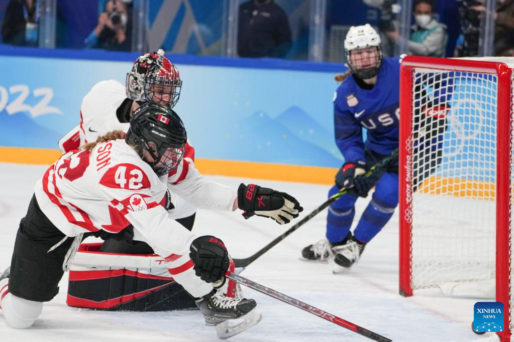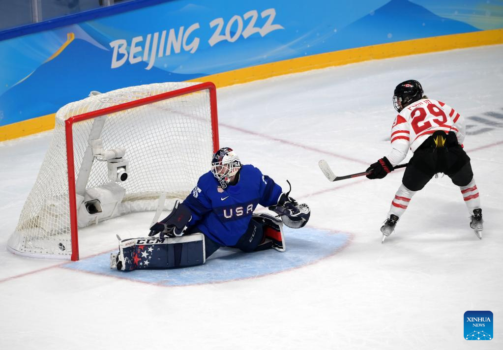 Marie-Philip Poulin (R) of Canada scores during the ice hockey women's preliminary round group A match between Canada and the United States at Wukesong Sports Centre in Beijing, capital of China, Feb. 8, 2022. (Xinhua/Li An)