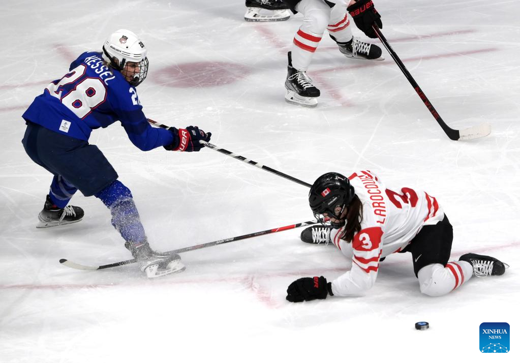 Jocelyne Larocque (R) of Canada vies with Kendall Amanda Kessel of the United States during the ice hockey women's preliminary round group A match between Canada and the United States at Wukesong Sports Centre in Beijing, capital of China, Feb. 8, 2022. (Xinhua/Li An)