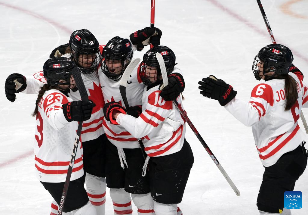 Athletes of Canada celebrate winning during the ice hockey women's preliminary round group A match between Canada and the United States at Wukesong Sports Centre in Beijing, capital of China, Feb. 8, 2022. (Xinhua/Li An)