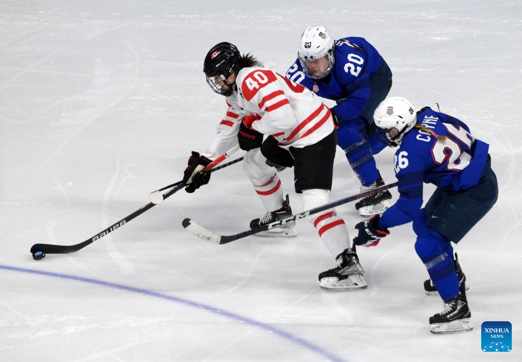 Blayre Turnbull (L) of Canada vies with Kendall Coyne Schofield (R) and Hannah Brandt of the United States during the ice hockey women's preliminary round group A match between Canada and the United States at Wukesong Sports Centre in Beijing, capital of China, Feb. 8, 2022. (Xinhua/Li An)