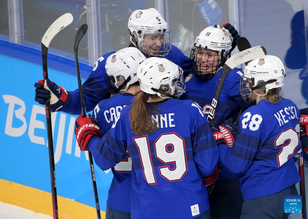 Athletes of the United States celebrate scoring during the ice hockey women's preliminary round group A match between Canada and the United States at Wukesong Sports Centre in Beijing, capital of China, Feb. 8, 2022. (Xinhua/Li An)