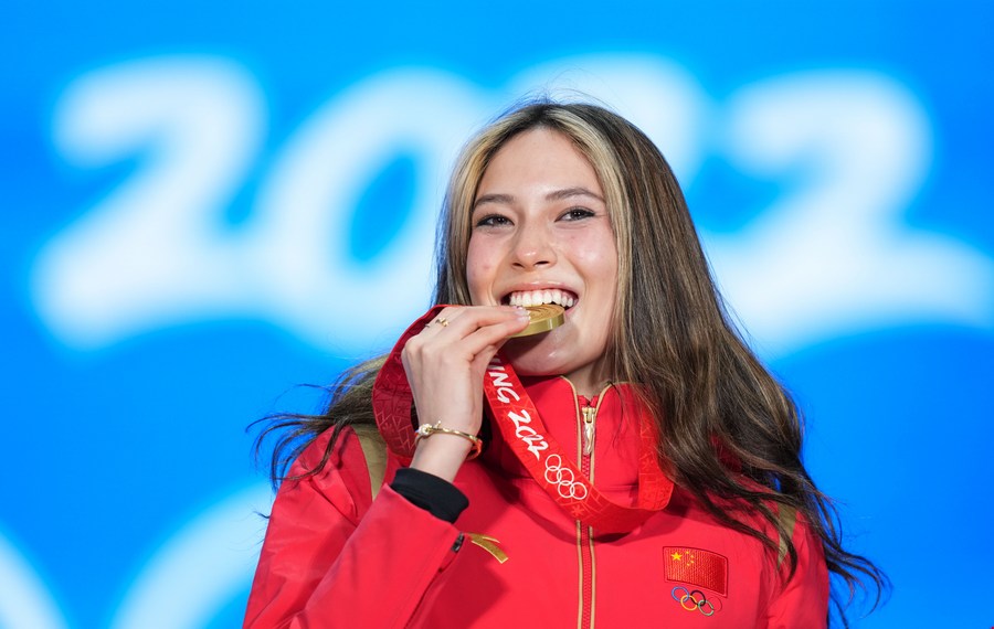 Gold medalist Gu Ailing during the awards ceremony of the women's freeski Big Air on Feb. 8, 2022. (Xinhua/Ju Huanzong)