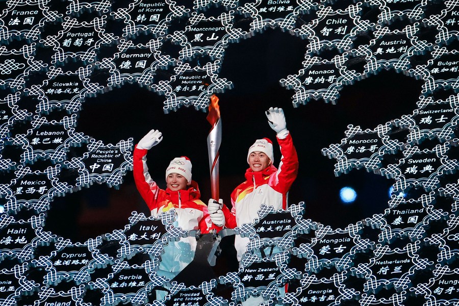 Dinigeer Yilamujiang (L) and Zhao Jiawen light the Olympic cauldron at the opening ceremony of the Beijing 2022 Olympic Winter Games at the National Stadium in Beijing, Feb. 4, 2022. (Xinhua/Liu Xu)
