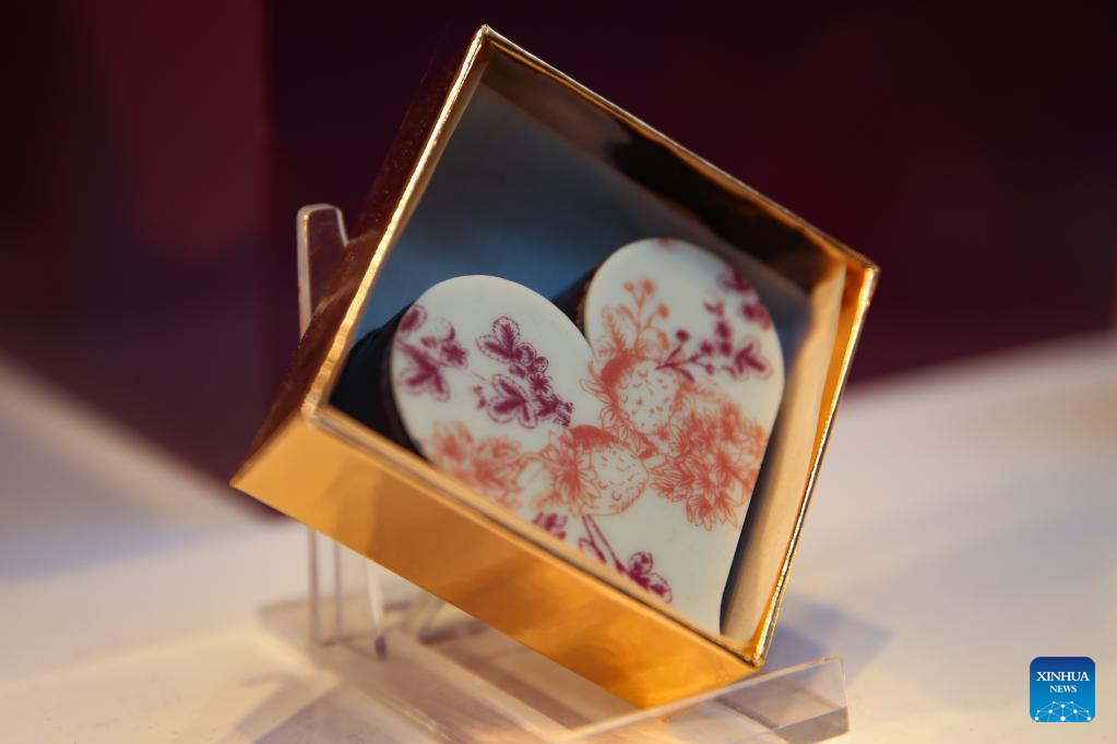 A chocolate in the theme of Valentine's Day is seen at a shop in Brussels, Belgium, Feb. 8, 2022. As the Valentine's Day approaches, new products by Belgian chocolate manufacturers have been put into market to attract shoppers. (Xinhua/Zheng Huansong)