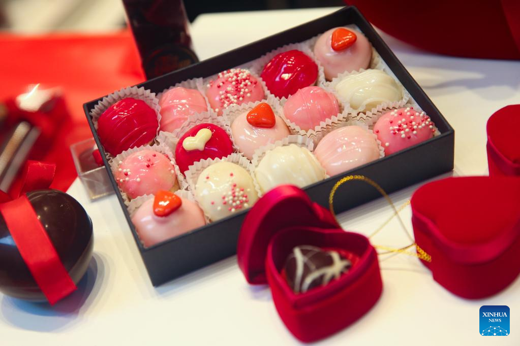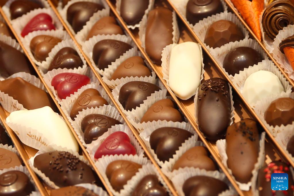 Chocolates in the theme of Valentine's Day are seen at a shop in Brussels, Belgium, Feb. 8, 2022. As the Valentine's Day approaches, new products by Belgian chocolate manufacturers have been put into market to attract shoppers. (Xinhua/Zheng Huansong)