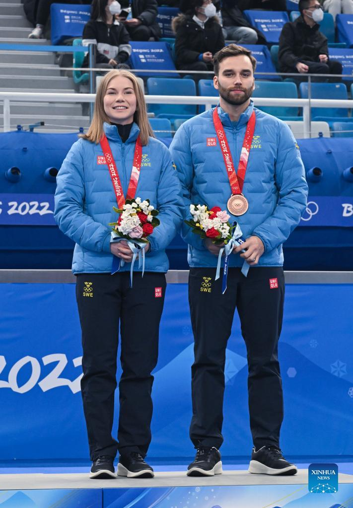 Bronze medalists Almida de Val (L) and Oskar Eriksson of Sweden attend the awarding ceremony of the curling mixed doubles event of the Beijing 2022 Winter Olympics at the National Aquatics Centre in Beijing, capital of China, Feb. 8, 2022. (Xinhua/Li He)