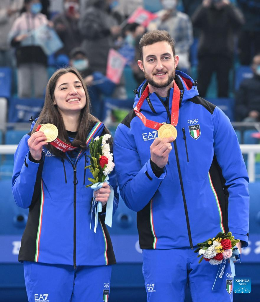 Gold medalists Stefania Constantini (L) and Amos Mosaner of Italy attend the awarding ceremony of the curling mixed doubles event of the Beijing 2022 Winter Olympics at the National Aquatics Centre in Beijing, capital of China, Feb. 8, 2022. (Xinhua/Li He)