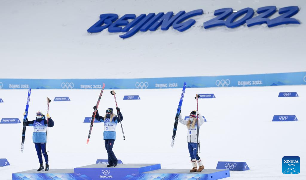 Gold medalist Jonna Sundling (C) of Sweden, silver medalist Maja Dahlqvist (L) of Sweden, and bronze medalist Jessie Diggins of the United States celebrate after the women's cross-country skiing sprint free final of the Beijing 2022 Winter Olympics at Zhangjiakou National Cross-country Skiing Centre in Zhangjiakou, north China's Hebei Province, Feb. 8, 2022. (Xinhua/Wang Song)